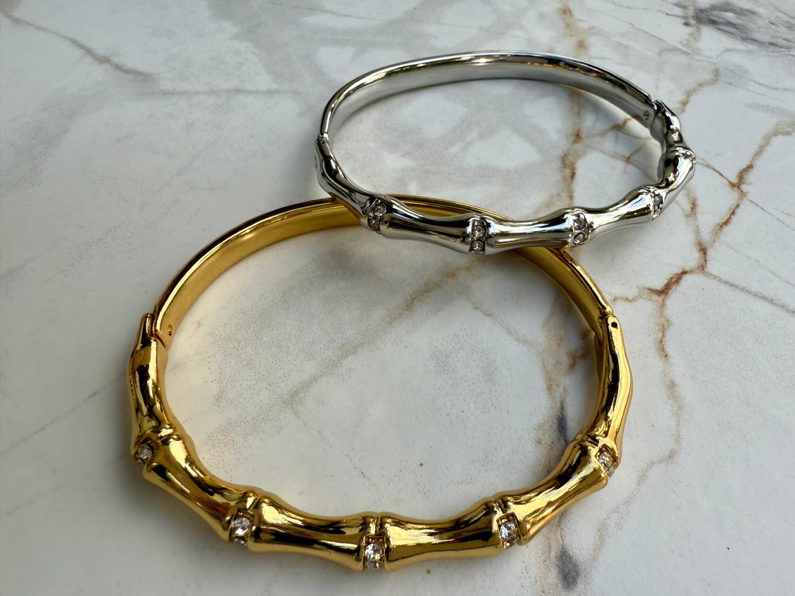 Sleek bamboo-inspired bangle accented with subtle crystal details, available in polished gold or silver for a refined, nature-chic touch.