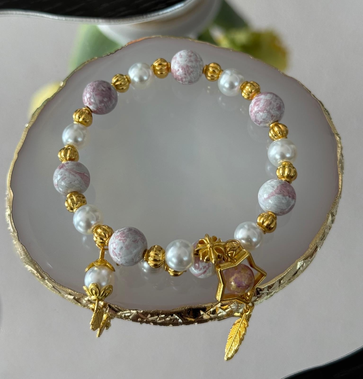 Elevate your style with the Celestia Charms bracelet — a graceful blend of elegance and whimsy. Crafted on durable memory wire for a comfortable, adjustable fit, this bracelet features lustrous beads in two captivating colorways: deep chocolate and gold with crystal-clear accents, or soft marbled pink with pearlescent highlights. Each bracelet is adorned with delicate gold-tone charms, including stars, leaves, and celestial motifs, making it a perfect accessory for day or night.