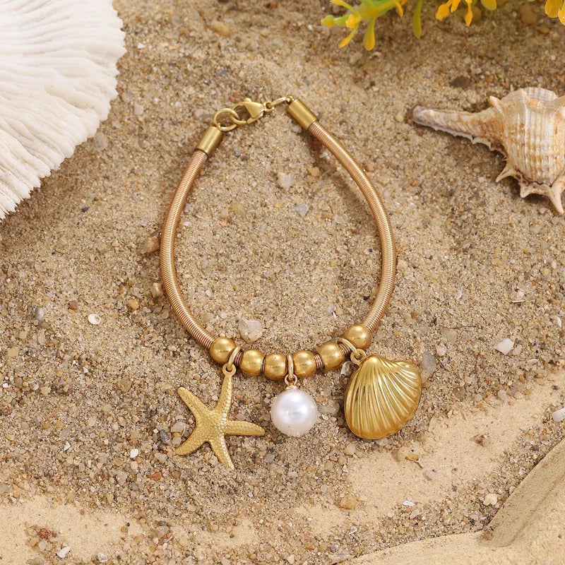 This delicate bracelet features three charming pendants—a starfish, a pearl, and a seashell—offering a timeless coastal touch in both gold and silver finishes.