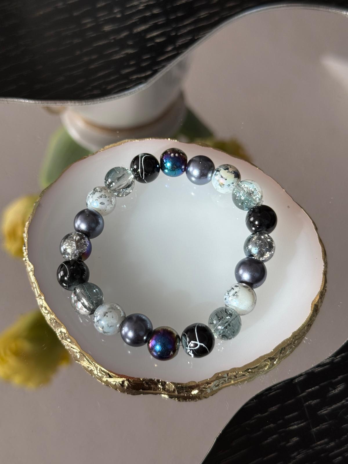 A captivating handmade bracelet with shimmering black, silver, and galaxy-toned beads, reflecting the mystery and elegance of the night sky.