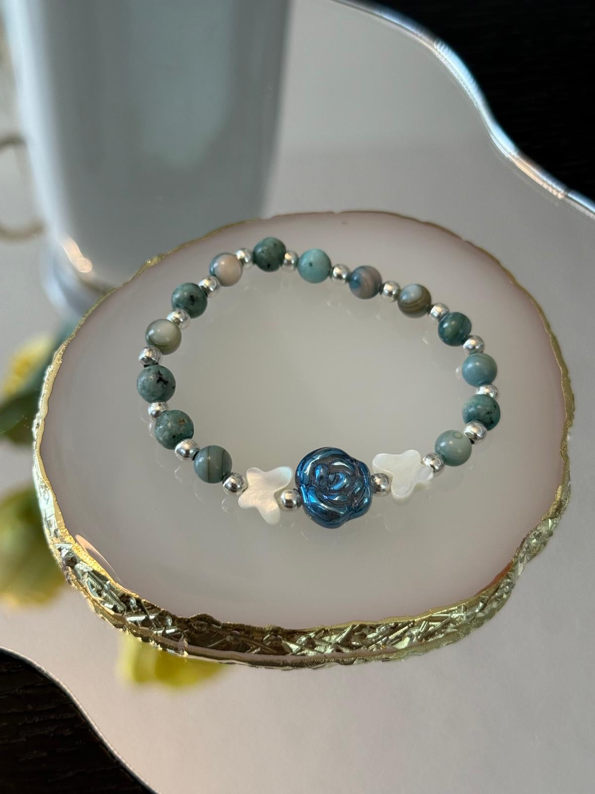 A handmade bracelet with soft green beads, accented by two pearly white butterflies and a delicate blue flower charm. Perfect for adding a whimsical, nature-inspired touch to any outfit.