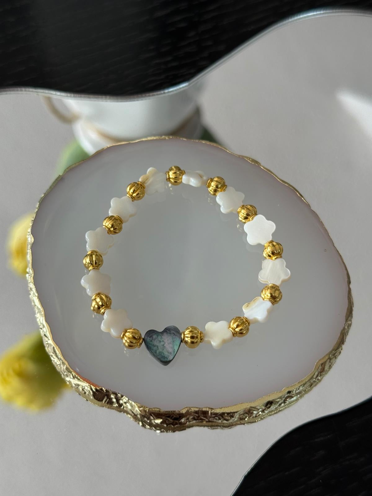Ethereal Heart blends celestial beauty with delicate charm. With luminous white clover-shaped beads, radiant gold spacers, and a captivating abalone heart centerpiece, this handmade bracelet captures the essence of quiet elegance and soulful style. Ideal for dreamers and romantics alike.
