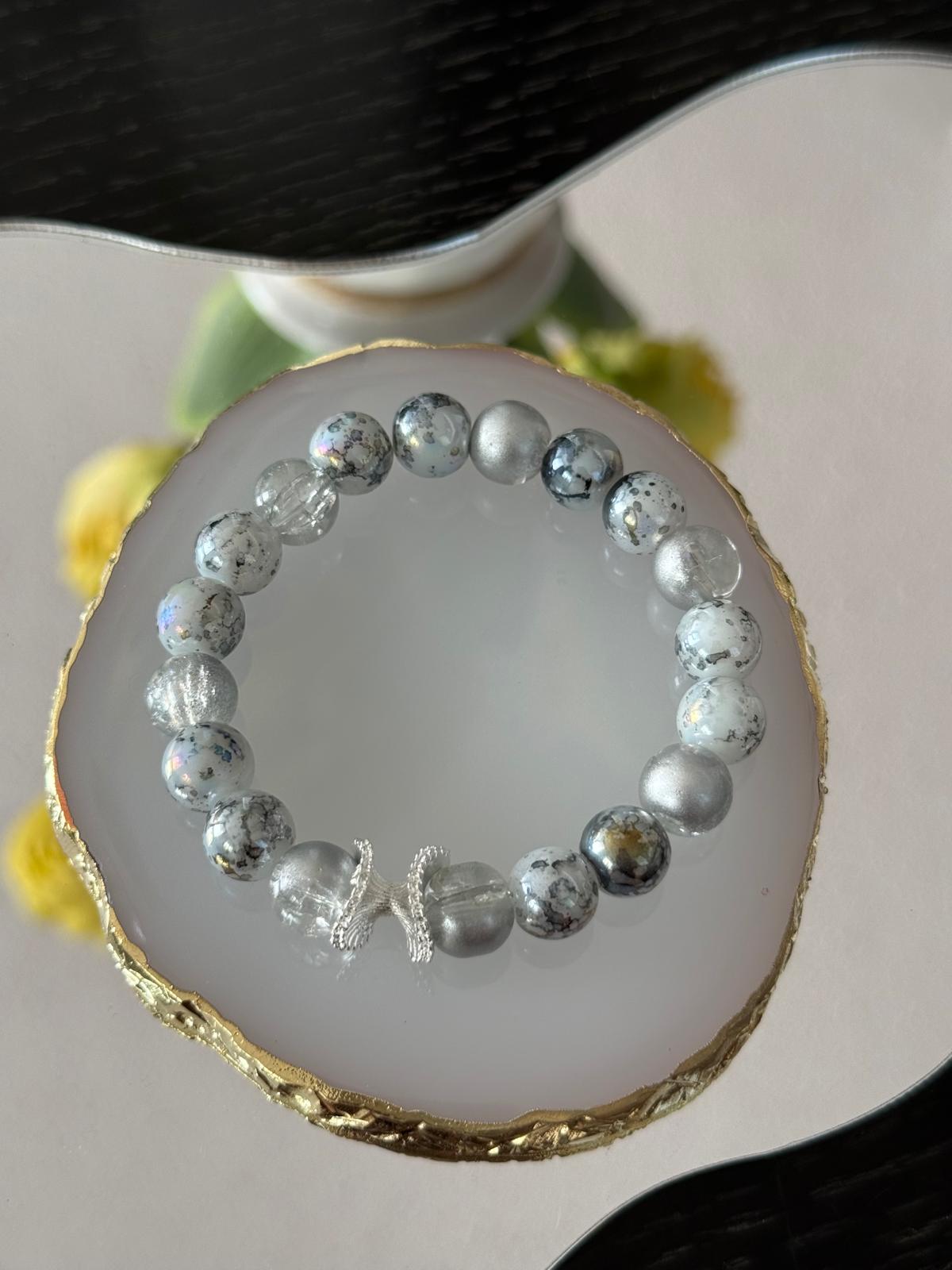Delicate yet bold, the Frost Veil Bracelet features a harmonious blend of marbled white stones, shimmering silver beads, and clear crackled glass, evoking the quiet elegance of a winter morning. Finished with a subtle silver knot, it's a piece that whispers sophistication and serenity.