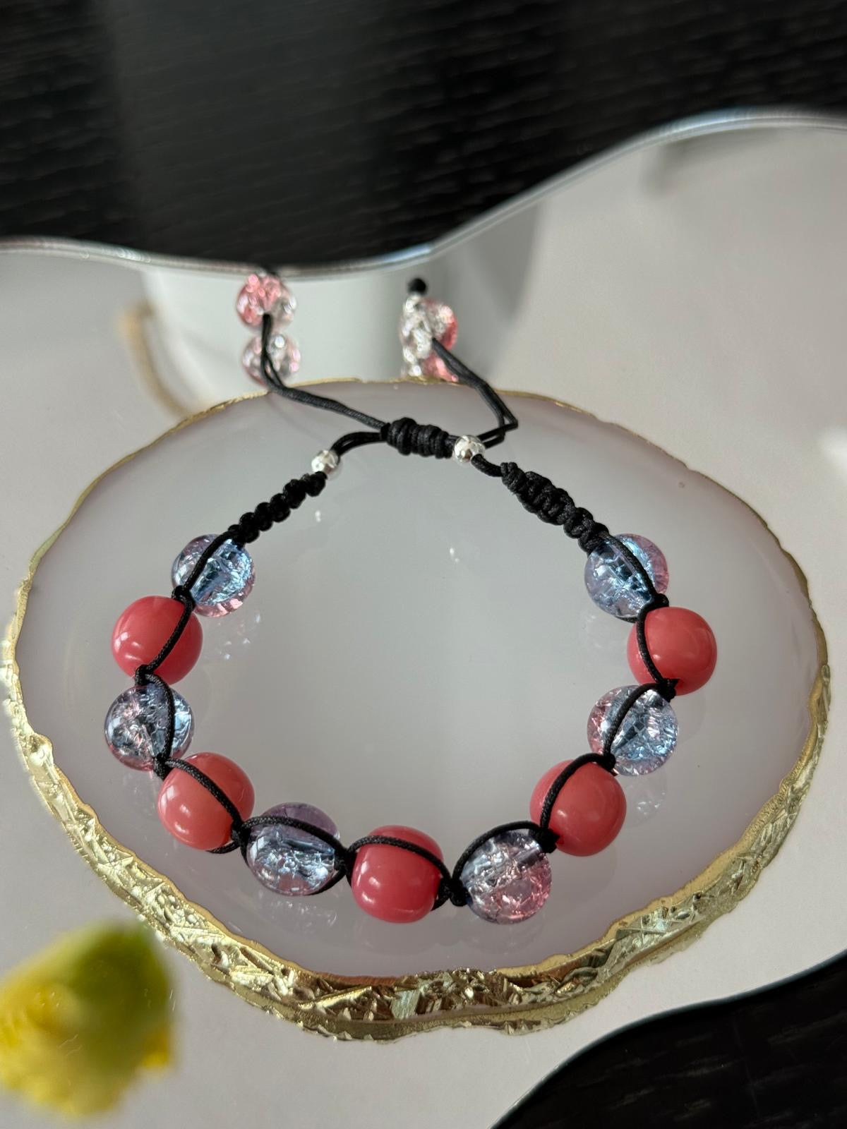 Galaxy Bloom is a vibrant handmade bracelet featuring a striking mix of glossy coral beads and shimmering glass-like spheres in hues of pink and lilac. Tied together with sleek black cord, this adjustable piece balances bold energy with cosmic elegance—a perfect statement of confidence and creativity.