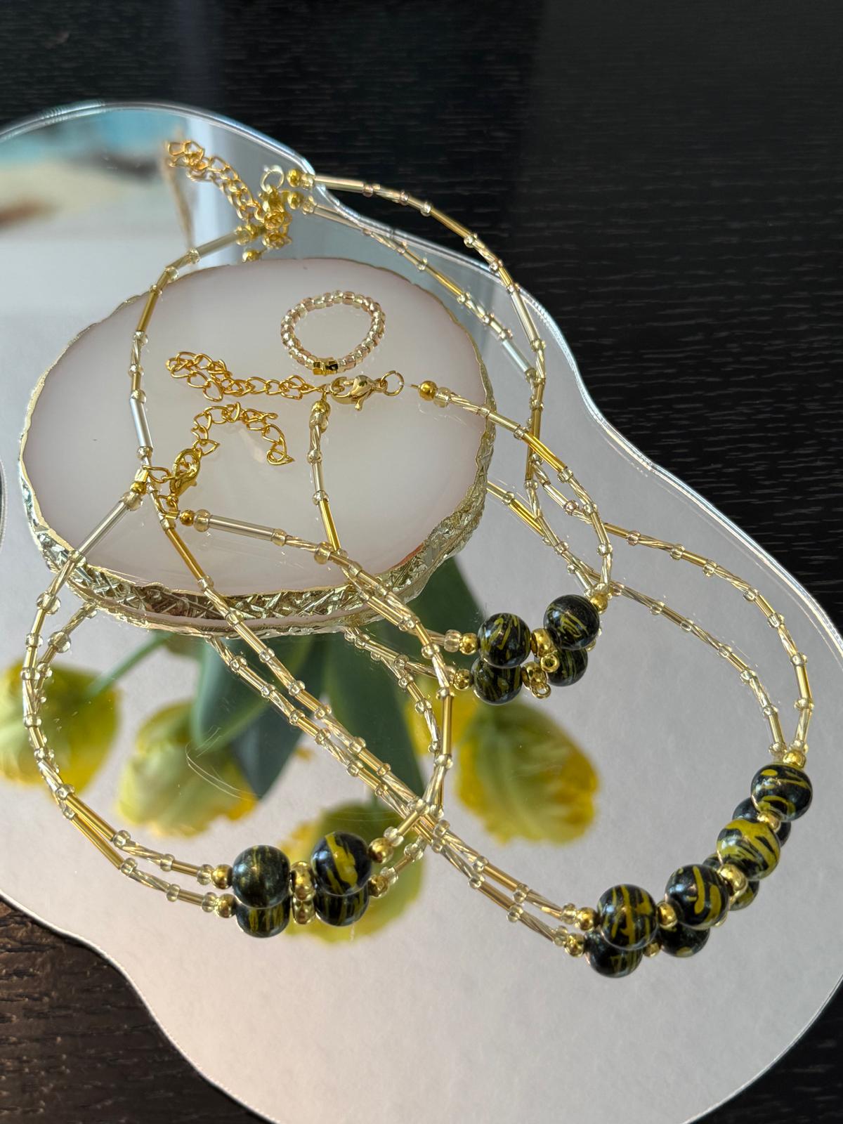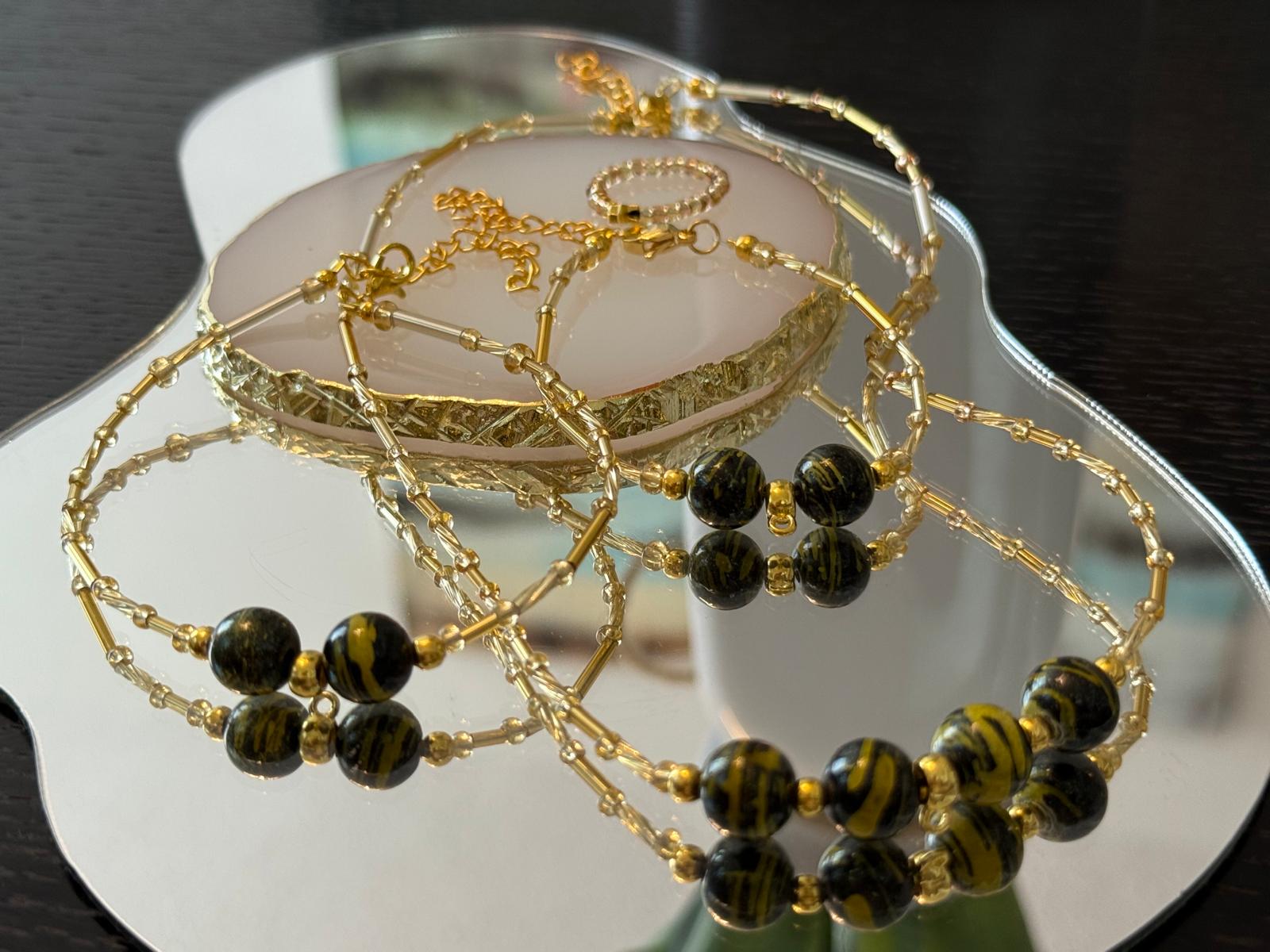 An elegant handmade set including a necklace, bracelet, anklet, and ring, all accented with gold tones.