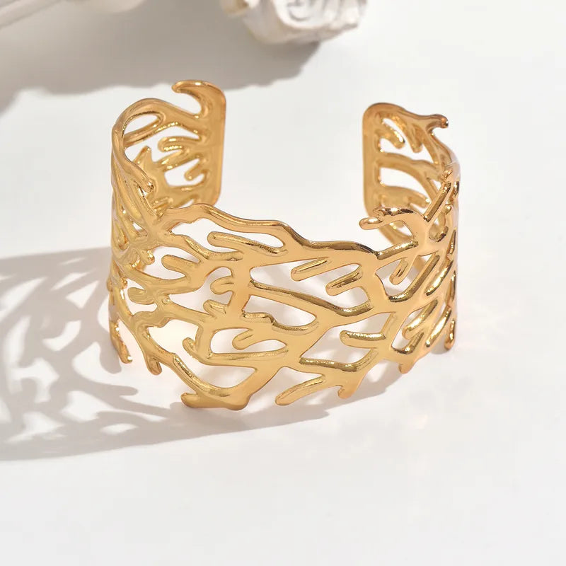 Inspired by the organic beauty of coral reefs, Golden Reef is a bold openwork cuff bracelet that captures the raw elegance of nature. Its intricate, wave-like design flows like ocean currents, while the radiant gold finish brings a luxurious, sunlit glow to your wrist. Lightweight yet striking, this sculptural piece is perfect for adding an artistic touch to both casual and statement looks — a wearable tribute to the wild beauty of the sea.