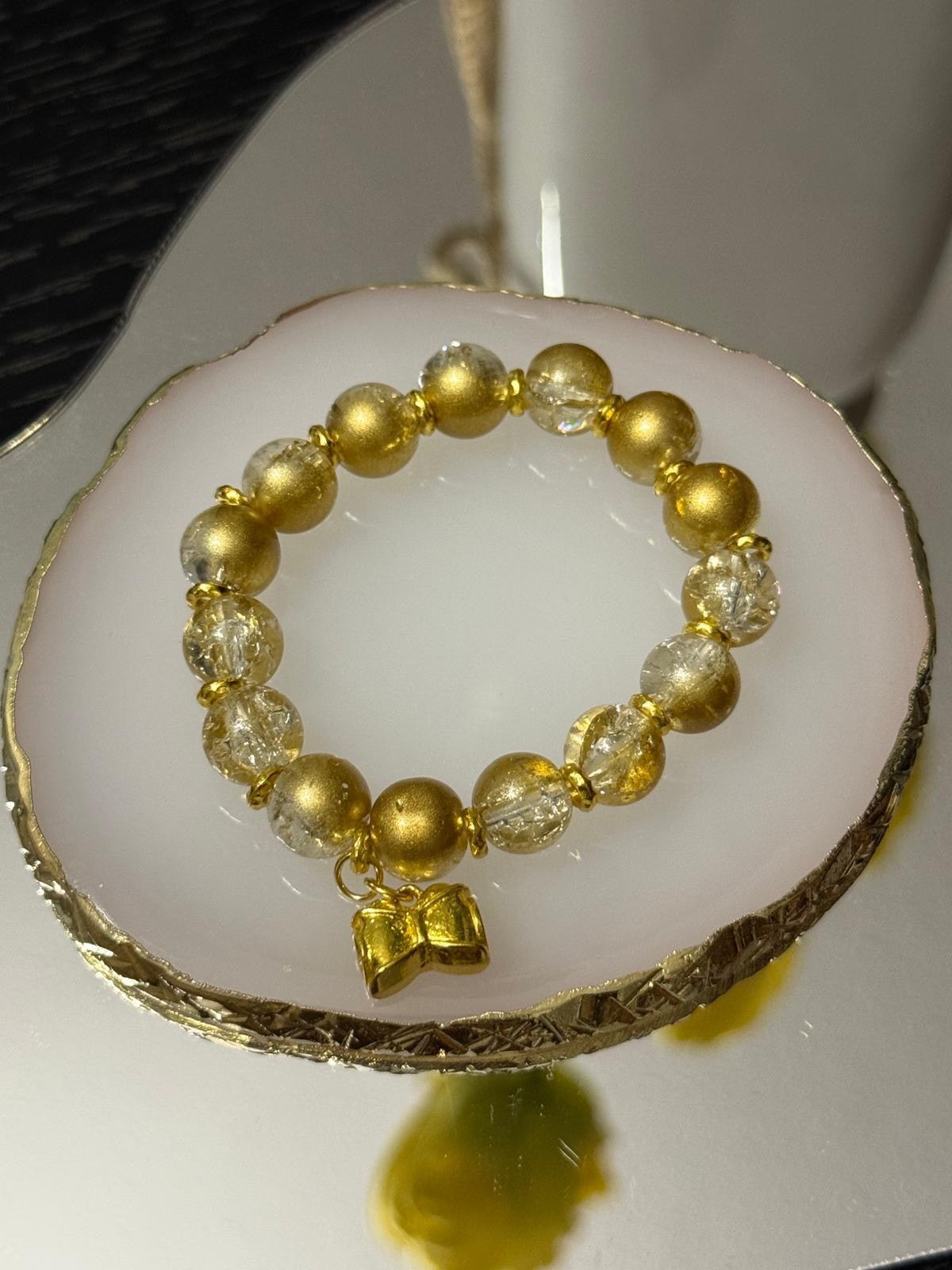 Embrace the warmth of elegance with Honey Aura, a handcrafted bracelet that radiates gentle luxury. Featuring a harmonious blend of crackled glass beads and matte gold-toned spheres, this piece captures the soft glow of honeyed light. Finished with a delicate bow charm, it’s the perfect accent for those who exude quiet confidence and timeless charm.