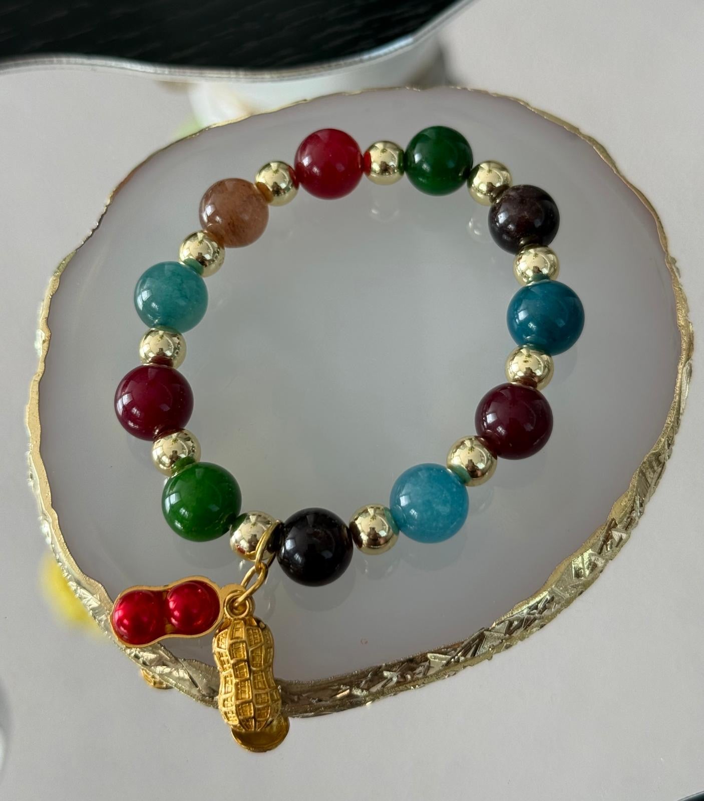 Bold, playful, and full of character, the Lucky Harvest Bracelet combines vibrant multicolored beads with golden accents to create a piece bursting with joyful energy. A standout feature is the whimsical gold peanut charm with a red pod, symbolizing abundance, prosperity, and a touch of humor. Each bead—ranging from rich emerald green and deep burgundy to sky blue and cocoa brown—adds a splash of personality, making this bracelet a celebration of diversity and good fortune. Perfect for those who love unique, meaningful accessories with a story to tell.