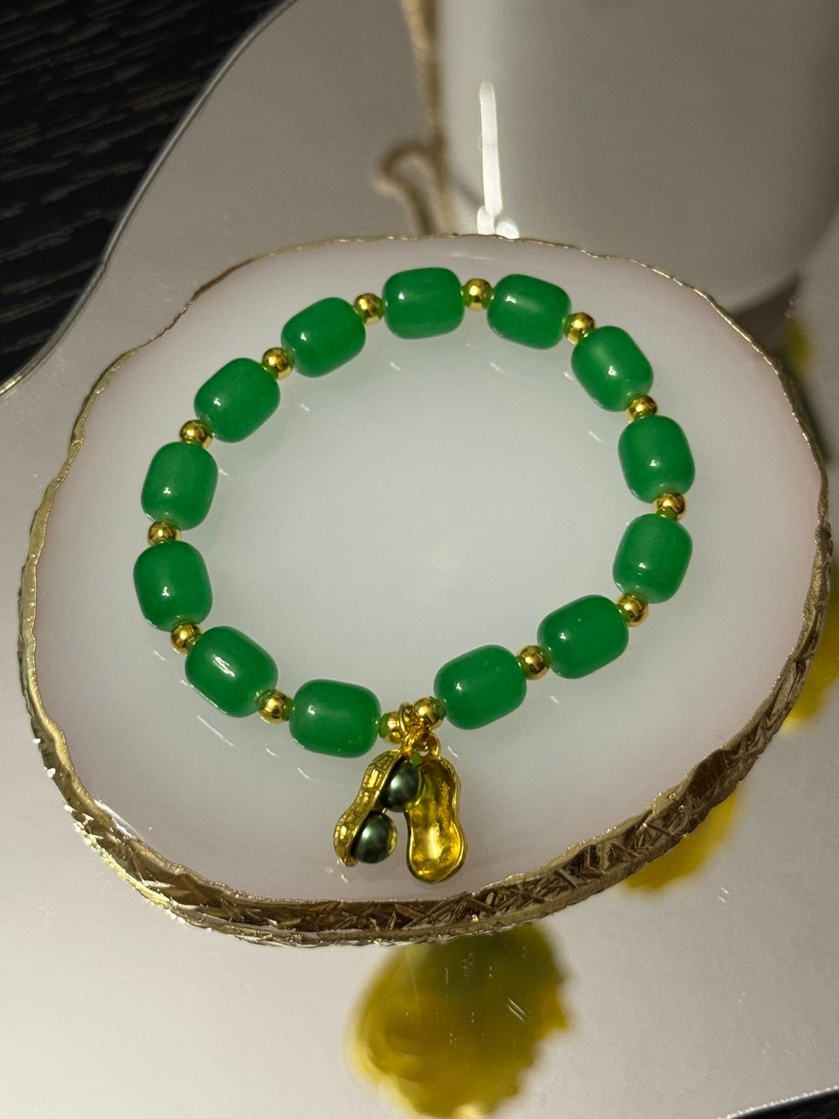 Playfully elegant, Lucky Peapod pairs rich jade-green beads with gleaming gold spacers for a bold yet grounded look. The highlight is a whimsical golden peapod charm housing glossy green pearls—symbolizing growth, abundance, and good fortune. A charming piece that adds life and luck to your day.
