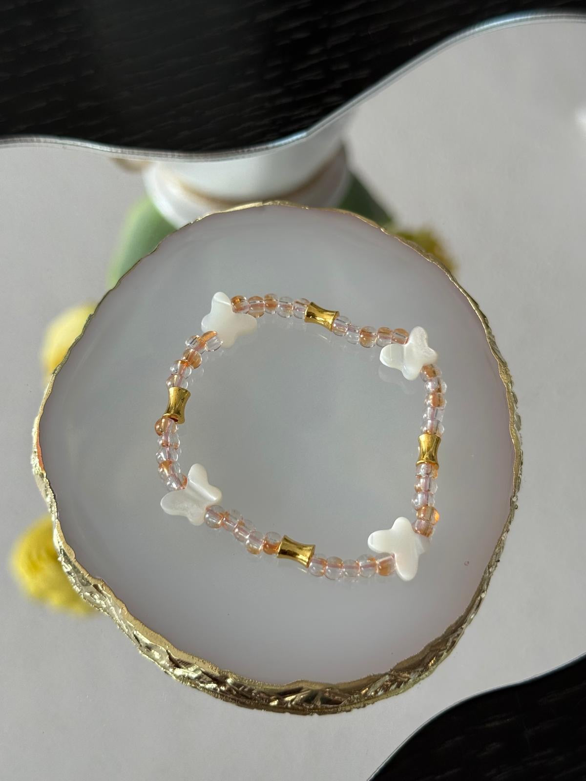 Delicately handcrafted, the Mariposa Lush bracelet flutters with soft elegance. Featuring ethereal butterfly-shaped accents in luminous mother-of-pearl tones, blush glass beads, and radiant gold touches, this piece captures the gentle charm of a garden in bloom. Lightweight yet luxurious, it's a graceful ode to transformation and feminine beauty.