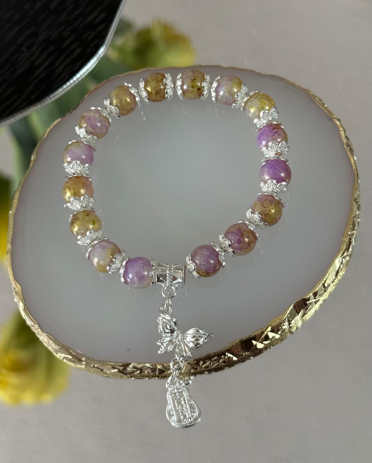 Let your spirit sing with Melody of Grace, a handcrafted bracelet featuring a harmonious blend of golden and lavender gemstone beads, delicately spaced with ornate silver-toned caps. The centerpiece charm—a silver lyre accompanied by a dainty butterfly and floral motif—symbolizes inspiration, transformation, and the beauty of artistic expression. Elegant and unique, this piece is perfect for those who carry music and grace in their soul.
