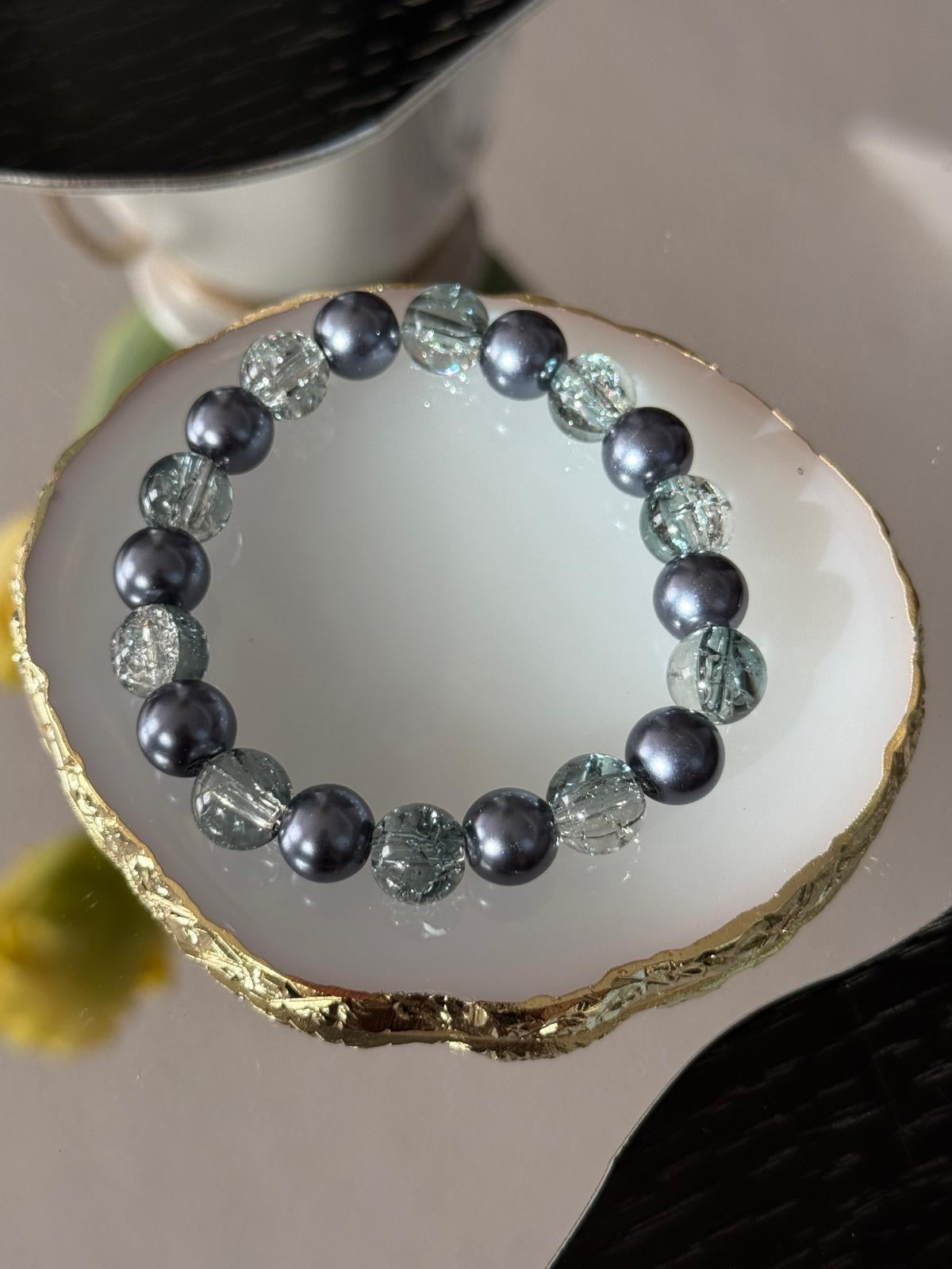 A captivating blend of mystery and shimmer, the Midnight Tide Bracelet pairs deep navy pearl-like beads with crackled glass spheres, evoking the serene power of moonlit waves. Elegant and enchanting, it’s perfect for adding a touch of nighttime glamour to your look.