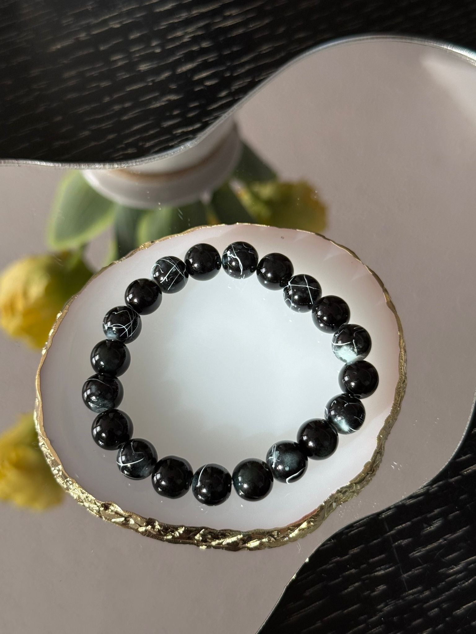 The Midnight Veil bracelet is a handmade piece featuring polished black beads threaded with elegant white veining, reminiscent of moonlight dancing across a night sky. Each bead tells a unique story with its subtle marbling, making this bracelet a perfect blend of mystery and sophistication. Set on a stretch cord for comfortable wear, it pairs effortlessly with both casual and formal looks, adding a touch of quiet power to your style.