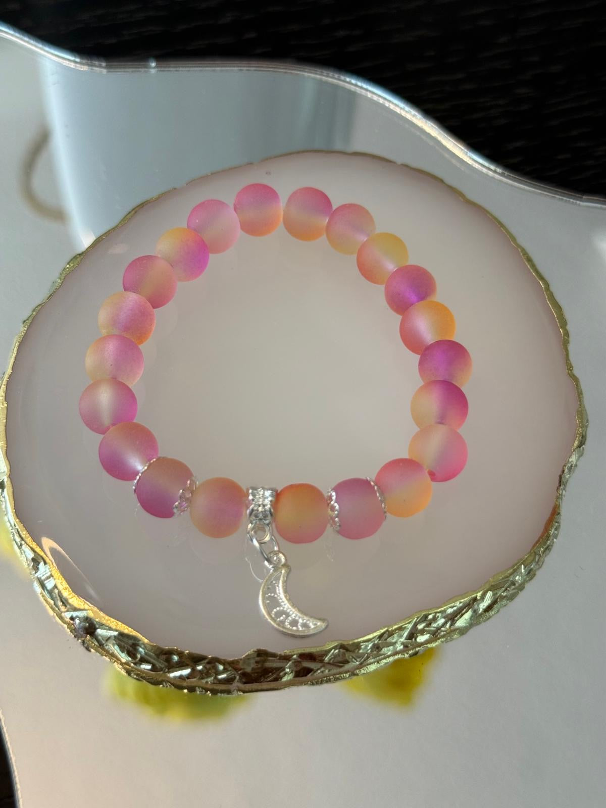 A delicate handmade bracelet featuring transparent pink and soft orange beads, accented with a charming moon pendant.