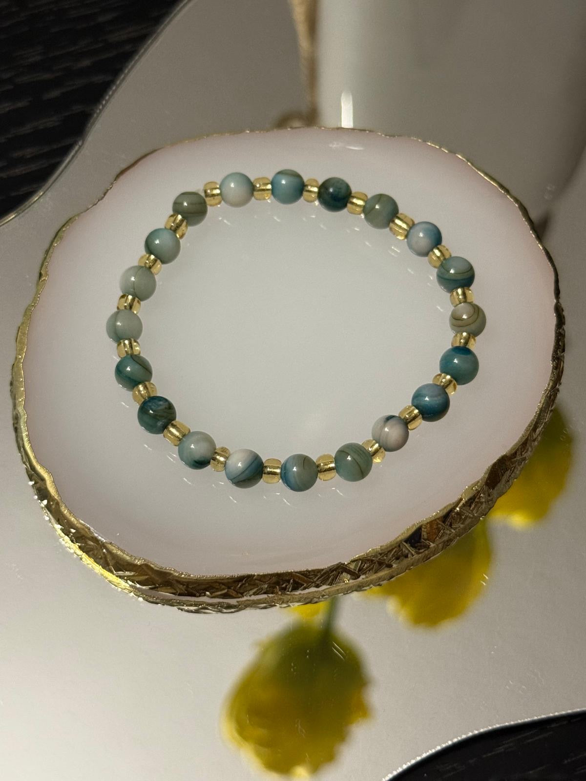 Handmade stretch bracelet featuring polished ocean-toned beads in soft greens and blues, accented with gold-toned spacers for a touch of elegance.