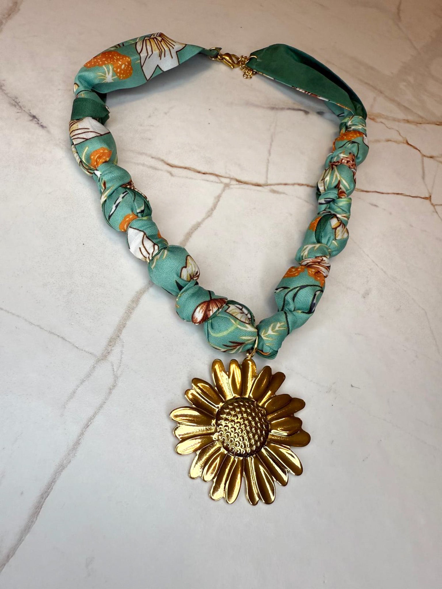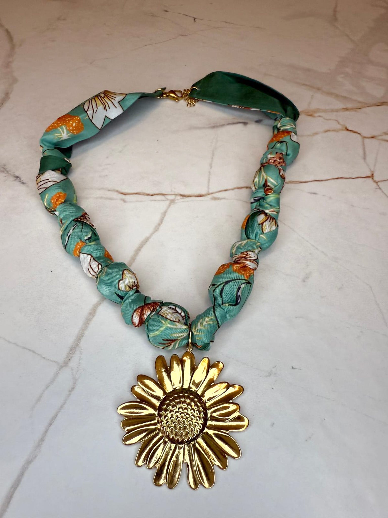 Soft yet vivid fabric tones fuse harmoniously with a golden sunflower charm, evoking a blossoming elegance full of life and warmth.