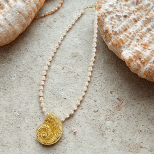 The Pearl Éclat Snail Necklace pairs lustrous pearls with a delicate snail pendant, creating a sophisticated statement piece that captures the essence of coastal elegance.