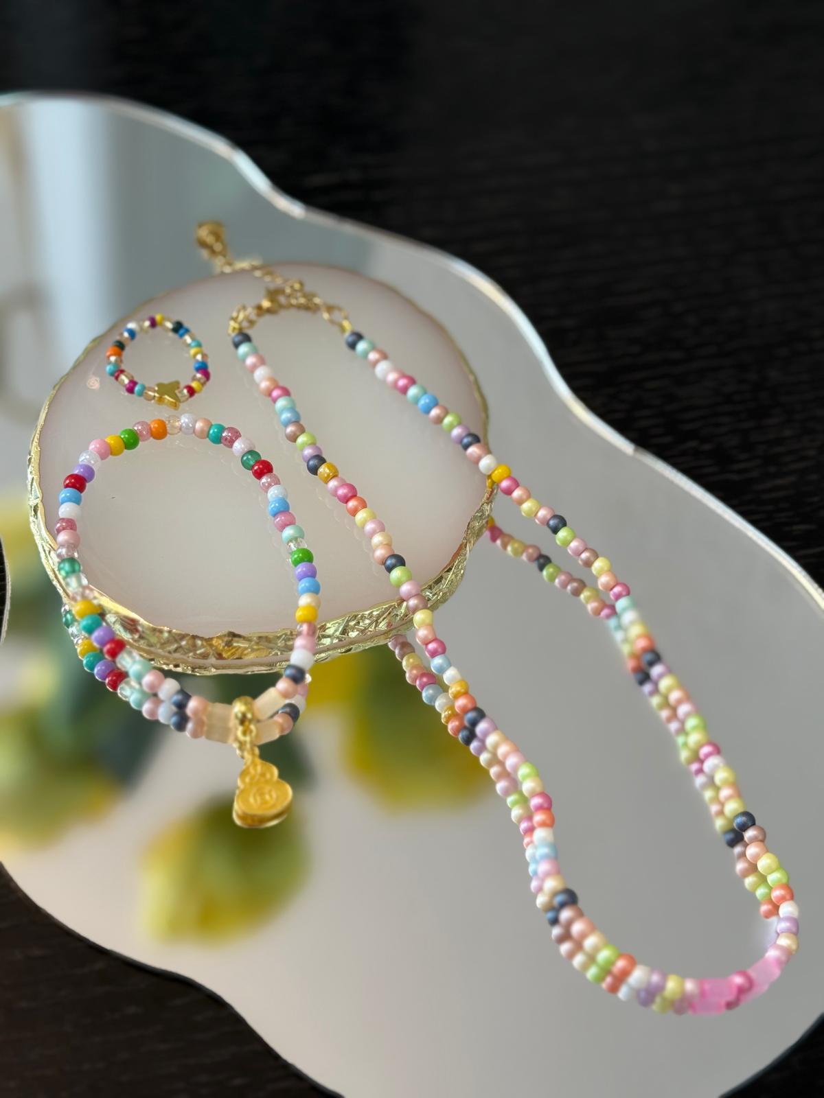 A vibrant handmade set featuring a necklace, bracelet, and ring adorned with tiny colorful beads. Fun, playful, and perfect for brightening up any outfit with a pop of color.