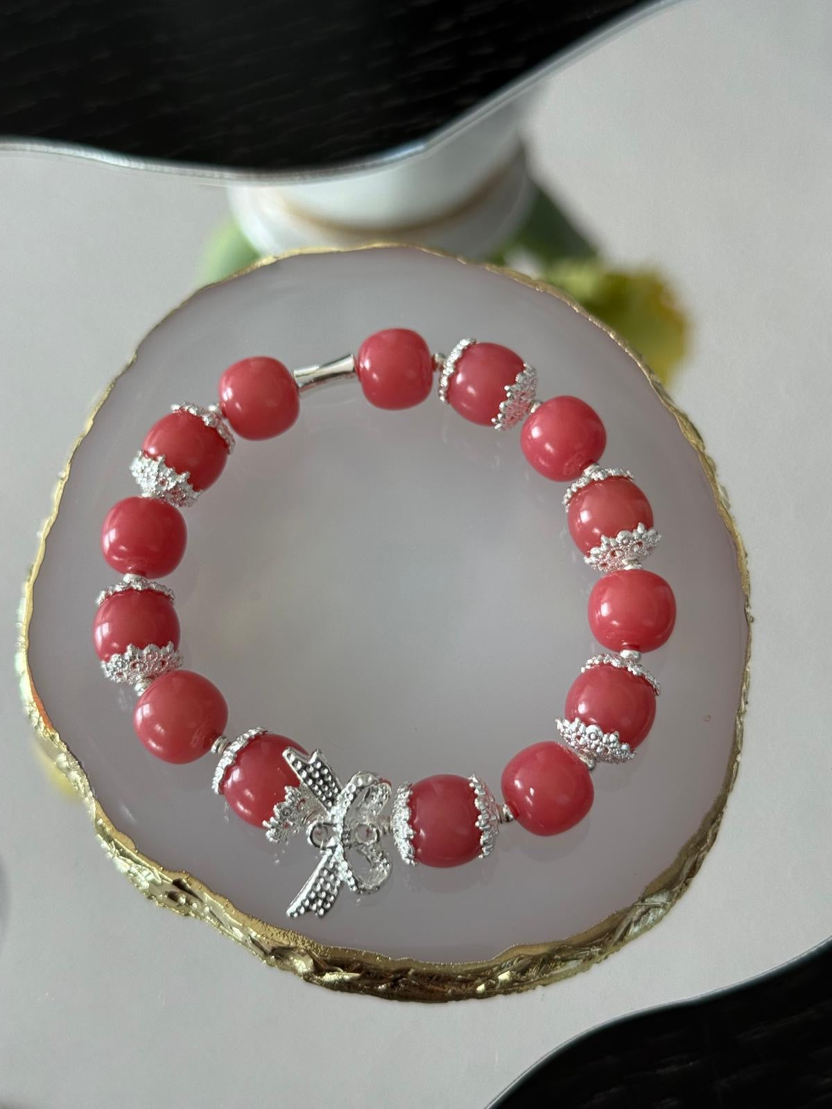 Delicate yet striking, the Rosette Grace bracelet showcases polished rose-toned beads framed with intricate silver crown spacers. At its center, a refined silver bow adds a graceful flourish, making this handmade piece a timeless expression of feminine elegance and charm. Ideal for both everyday refinement and special moments.