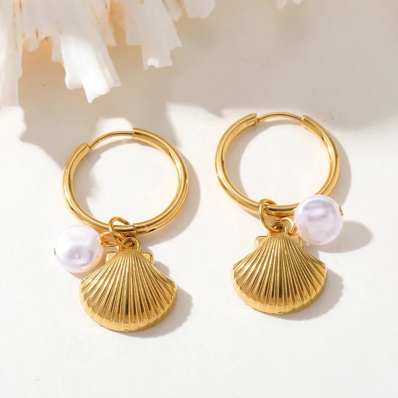 Gracefully shaped like a treasured seashell, this gold pendant pairs perfectly with a glowing pearl to bring the essence of the ocean’s summer glow to your look.