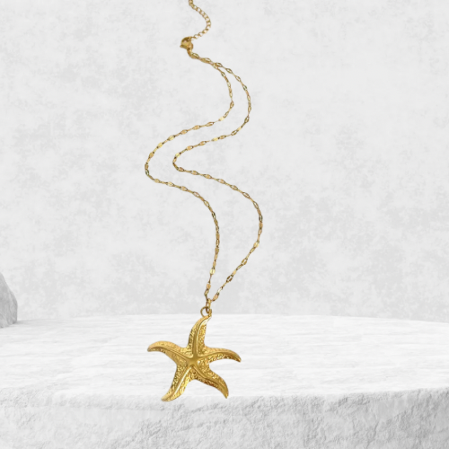 Gracefully suspended on a fine gold chain, the Stellar Wave pendant features a radiant sea star—an elegant symbol of the ocean’s shimmering waves and celestial beauty.