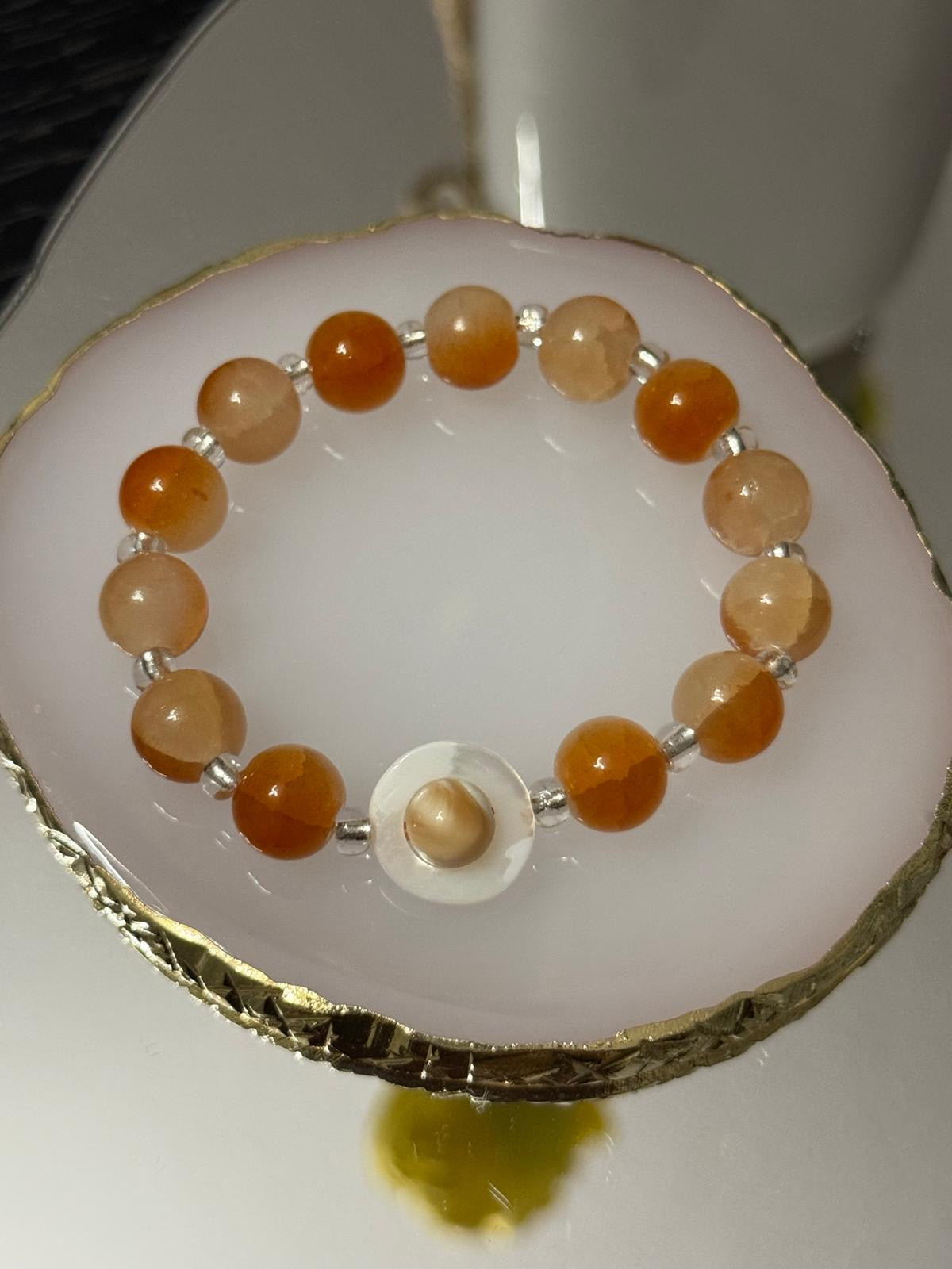 Warm amber and honey-toned beads encircle a central pearl-like charm, radiating golden hour glow in a vibrant, elegant design.