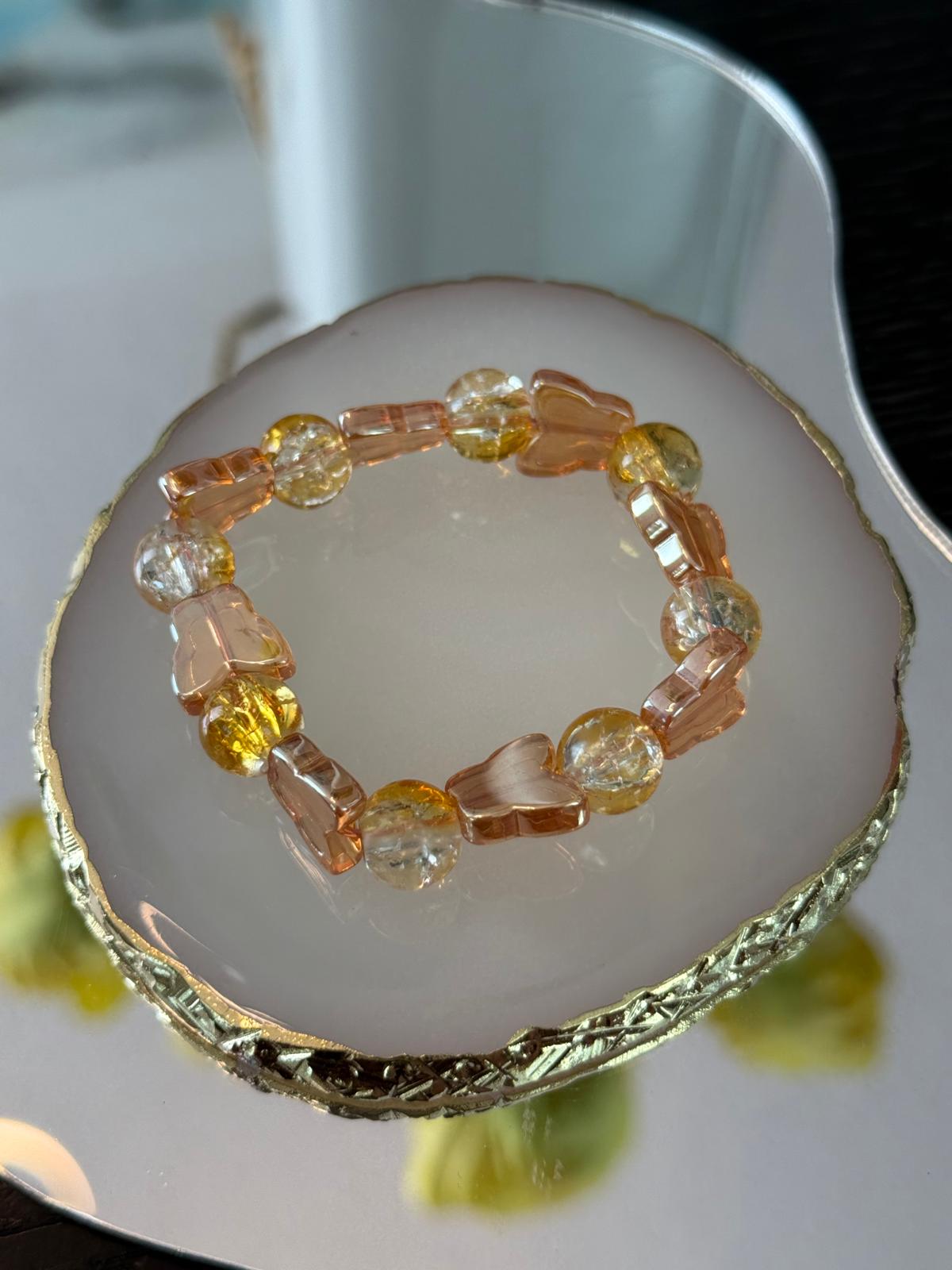 Handmade yellow bracelet accented with butterflies and soft orange details, bringing a cheerful and lively charm.