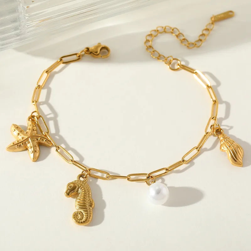 A playful dance of the sea—this gold chain bracelet features delicate ocean-inspired charms, from a graceful seahorse to a lustrous pearl, all swaying with the rhythm of the tides.