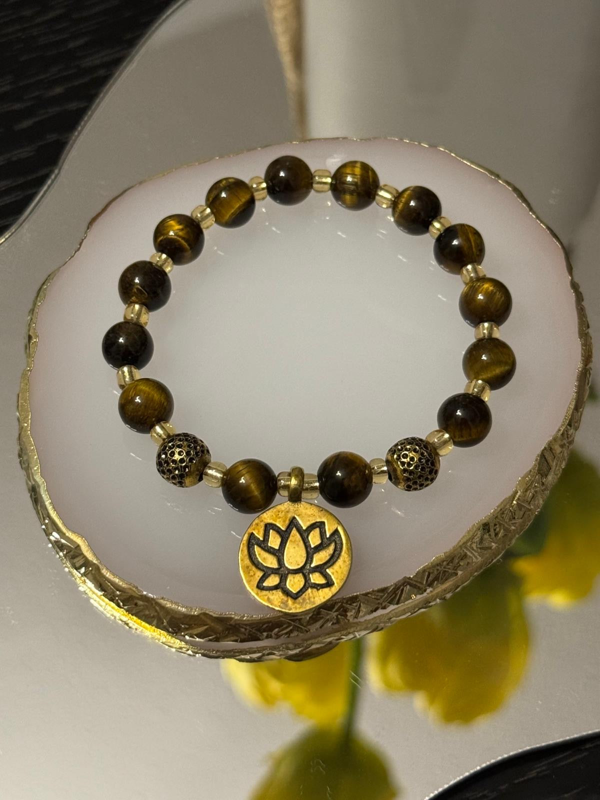 Crafted with golden-brown Tiger's Eye beads and accented with antique gold spacers, this bracelet exudes grounding energy and inner strength. The lotus charm symbolizes spiritual awakening and calm resilience, making it a perfect companion for mindful living.