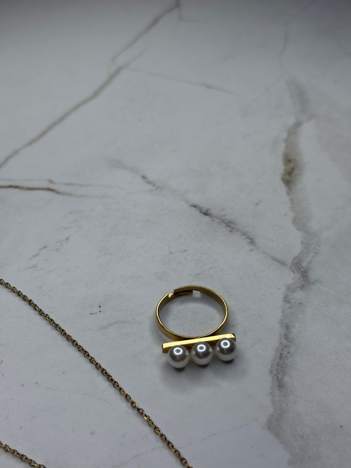 The Trio Perlé Set brings together a graceful gold necklace, matching earrings, and ring—each adorned with three delicate mini pearls. This harmonious trio blends timeless elegance with modern simplicity, offering a refined and cohesive look that effortlessly enhances any outfit, day or night.