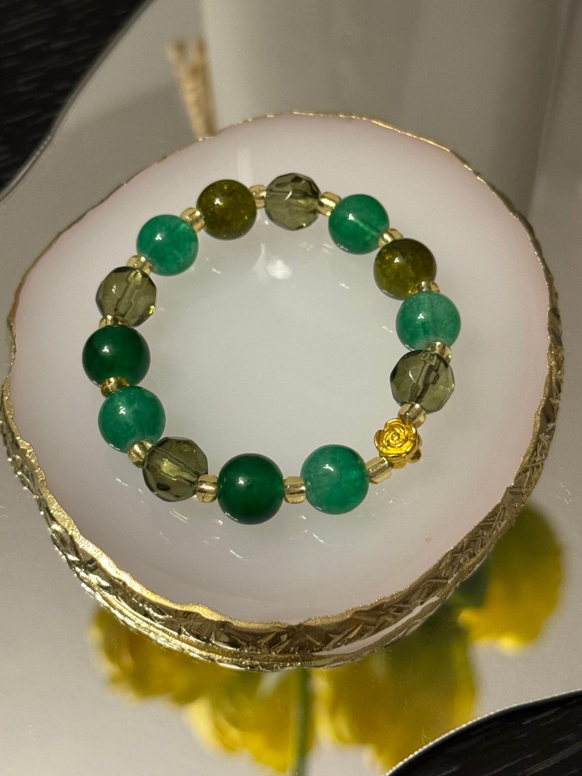 Rich green and olive-hued beads meet golden accents in this nature-inspired bracelet, finished with a radiant gold rose charm. Selva Dorada (“Golden Jungle” in Spanish) embodies earthy beauty with a luxurious touch—perfect for those who feel grounded yet luminous.