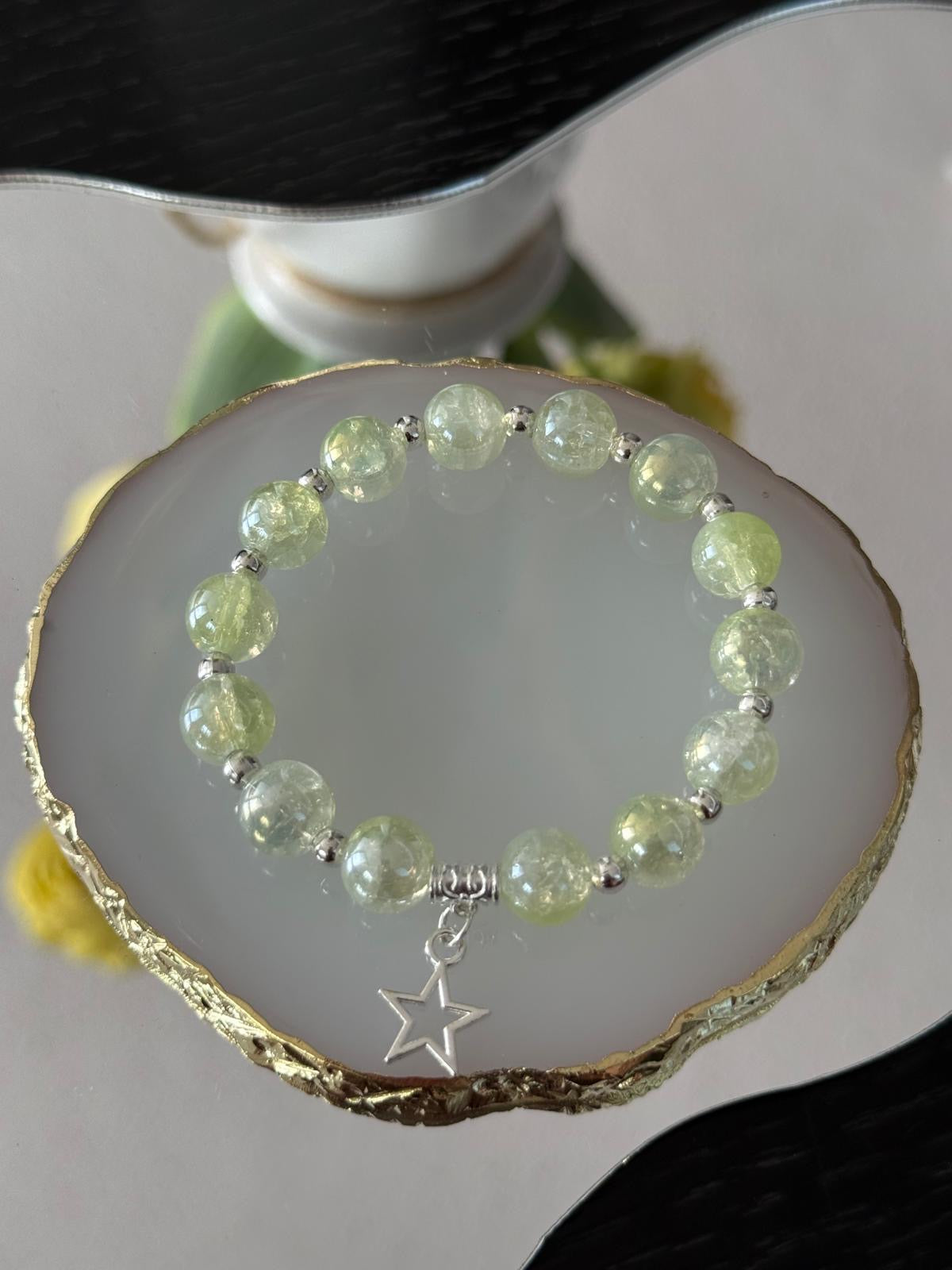 The Verdant Light Bracelet captures the refreshing essence of new growth and radiant energy. Featuring translucent green crackle beads that shimmer with light, this handmade piece is accented by sleek silver spacers and a delicate open star charm—symbolizing hope and clarity. Its soft green hue evokes the vitality of nature in spring, while the star adds a subtle celestial touch. Lightweight and soothing, it's the perfect bracelet for those who appreciate harmony, renewal, and quiet elegance.