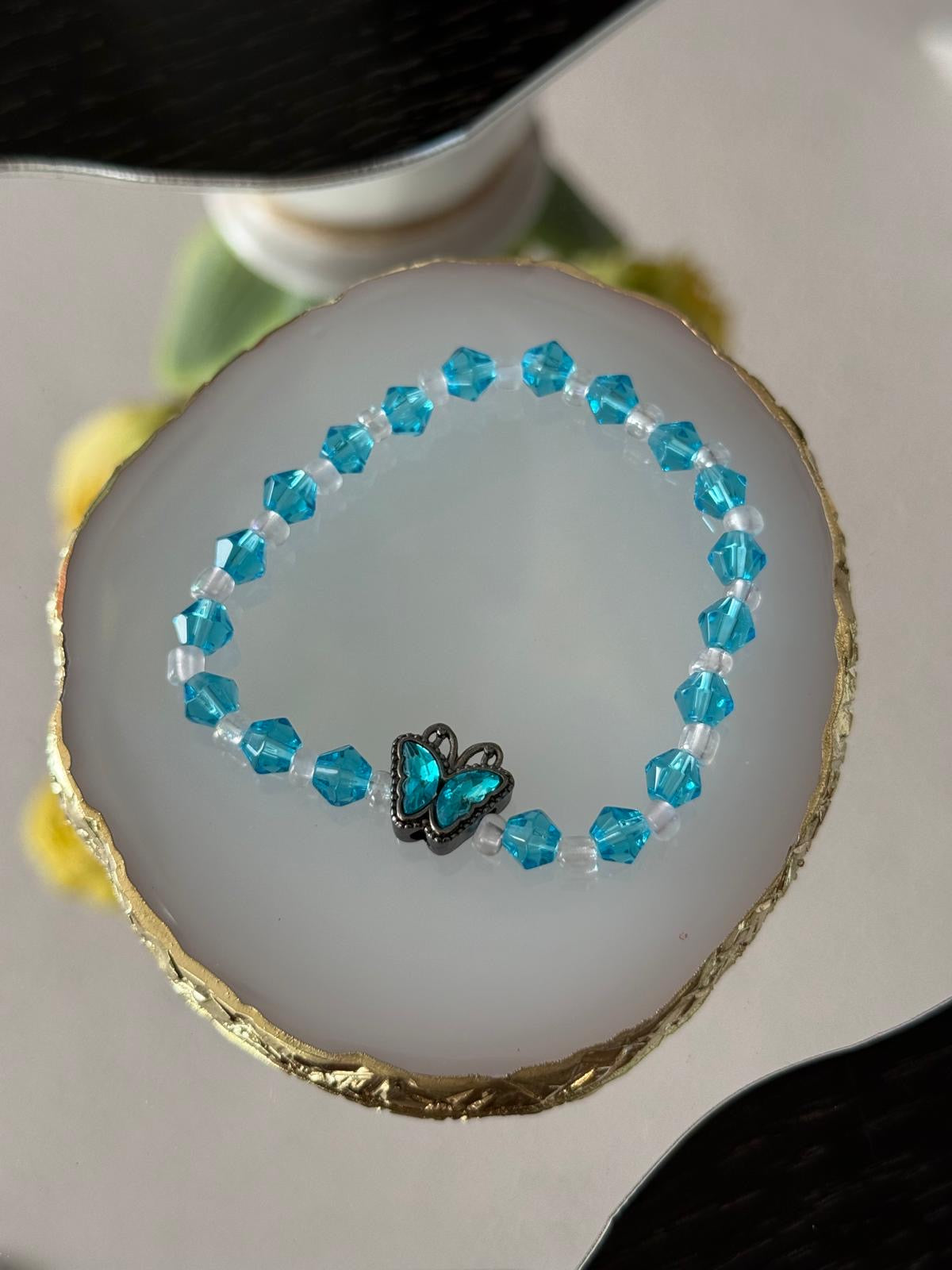 Delicate and dreamy, the Whimsy Wings bracelet features shimmering faceted crystals in a soft periwinkle blue, accented by a radiant iridescent butterfly charm that adds a magical touch. Perfect for those who love whimsical elegance and gentle color. Also available in a serene turquoise variation for a splash of ocean-inspired charm.